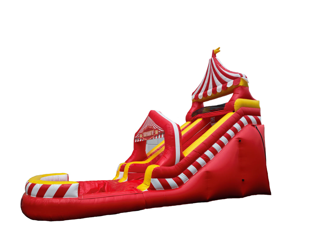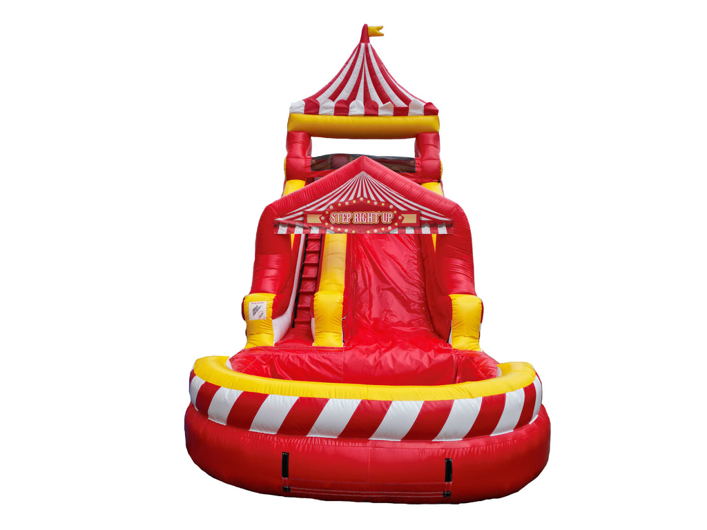 The 15FT Carnival Water Slide measures 27′ L × 13′ W × 21′ H and features bright red, yellow, and blue colors that capture the fun of a classic carnival. This single-lane slide ends in a refreshing splash pool, making it a popular choice for birthdays, school events, and summer celebrations. Compact enough to fit in most backyards yet tall enough to bring excitement, this slide is built from commercial-grade vinyl with reinforced seams and multiple anchor points for durability and safety. Each unit includes a 1.5 HP blower, repair kit, storage bag, and a 1.5-year manufacturer's warranty.
