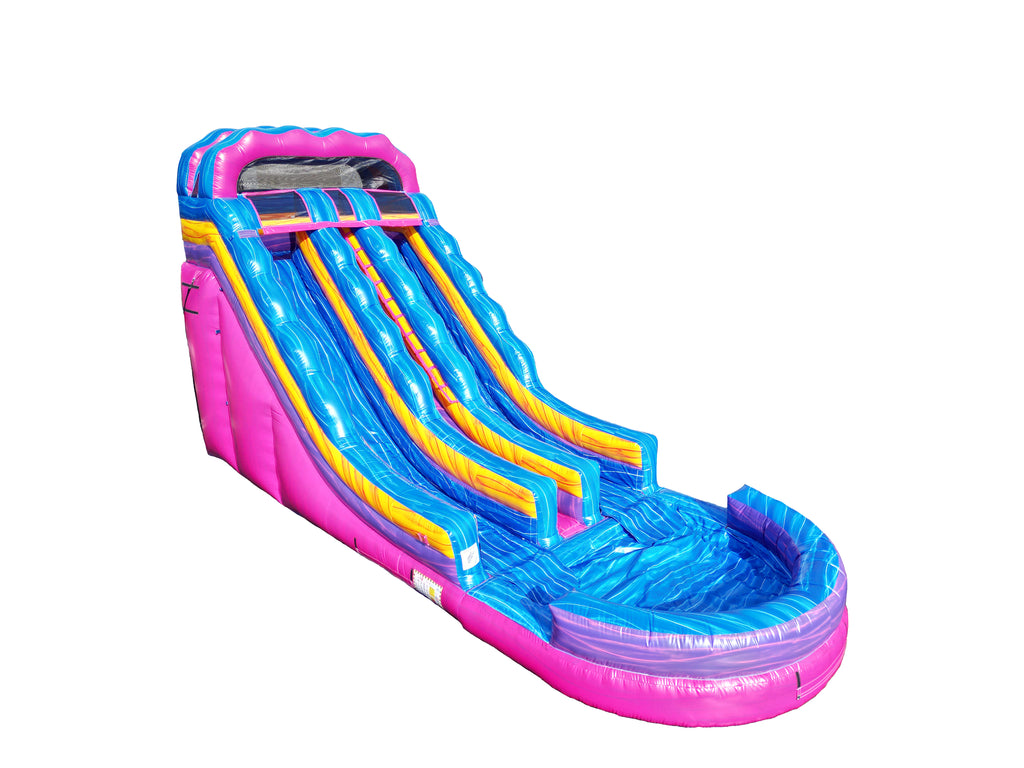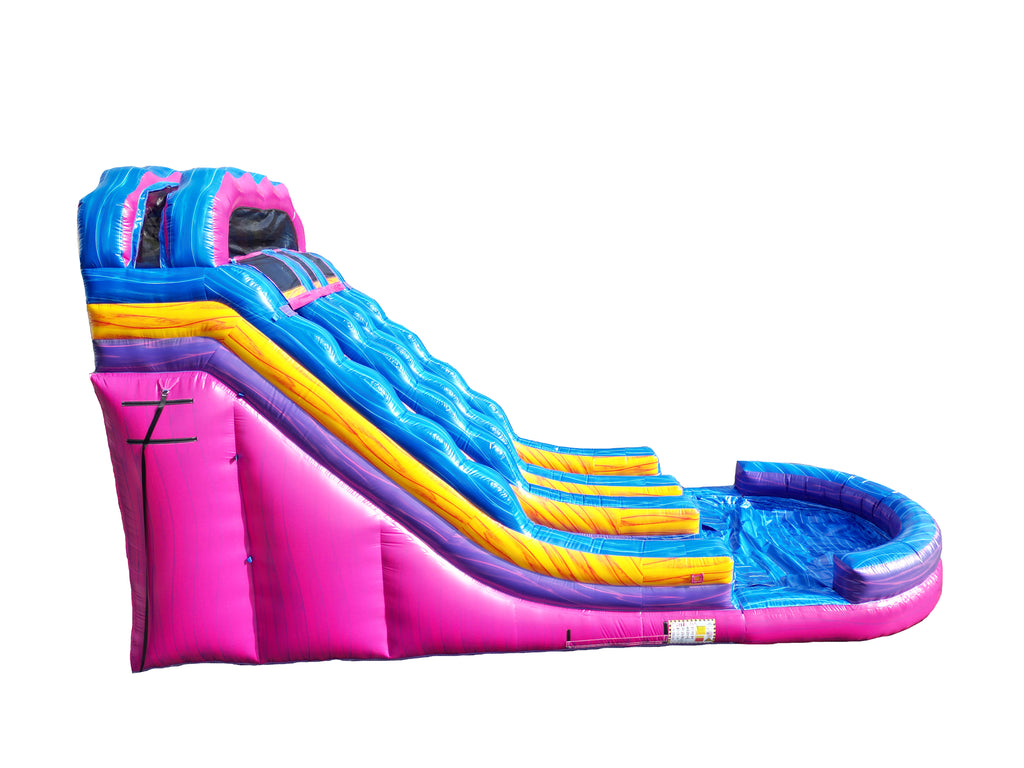 The Summer Blast Dual Lane Water Slide features a vibrant blend of pink, blue, and yellow colors with two fast racing lanes that lead into an extended splash pool, making it an ideal centerpiece for backyard parties, school events, and summer celebrations. This brightly colored slide offers exciting side-by-side action for riders of all ages and is built from 16 oz commercial-grade PVC vinyl with reinforced stitching for durability and easy maintenance. With its eye-catching tropical look and reliable performance, the Summer Blast Dual Lane Water Slide delivers strong rental appeal throughout the entire warm season.