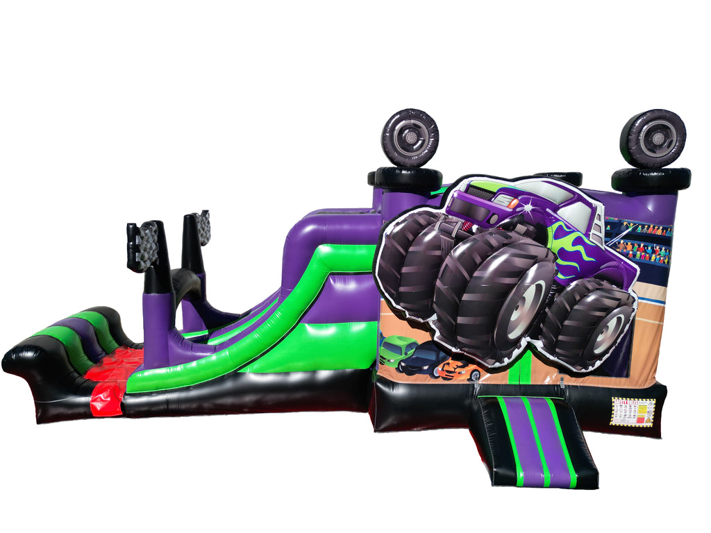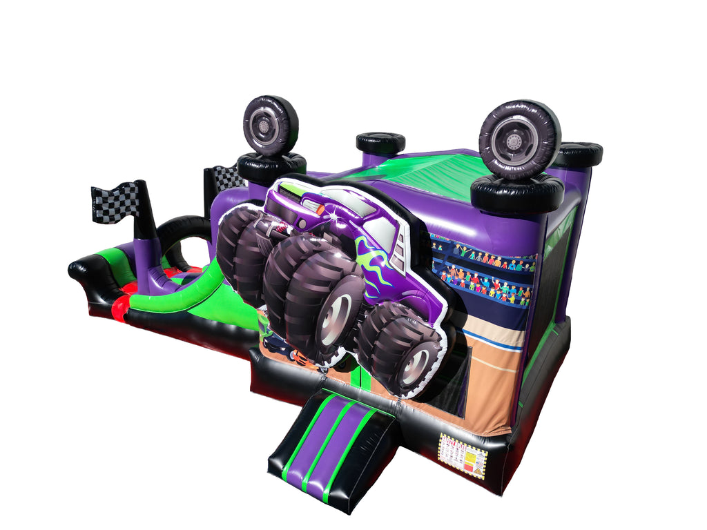 The 3D 27ft Digger Monster Combo measures 27 x 13 x 14 and features a large bounce area paired with an exciting slide, all wrapped in a bold monster truck design that instantly grabs attention. The oversized truck graphic and vibrant colors make it a favorite for truck lovers and high-energy parties. Mesh panels allow for visibility and airflow, while the long slide adds extra fun for kids who want nonstop action. This combo is a great choice for birthdays, school events, and larger backyard setups where you want something that stands out.