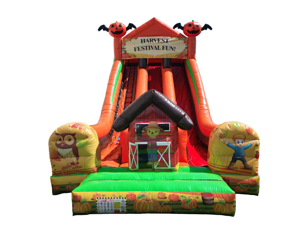 The Harvest Dual Lane Slide measures 39′ L × 24′ W × 15.5′ H and brings a festive autumn theme to any event. With two wide sliding lanes, this inflatable keeps the fun moving while showcasing colorful fall graphics, pumpkins, and seasonal details that make it perfect for harvest festivals, school carnivals, and community celebrations. Built from durable commercial-grade vinyl with reinforced seams and multiple anchor points, this unit is designed for safety and long-lasting use. Each slide includes a 1.5 HP blower, repair kit, storage bag, and a 1.5-year manufacturer warranty.