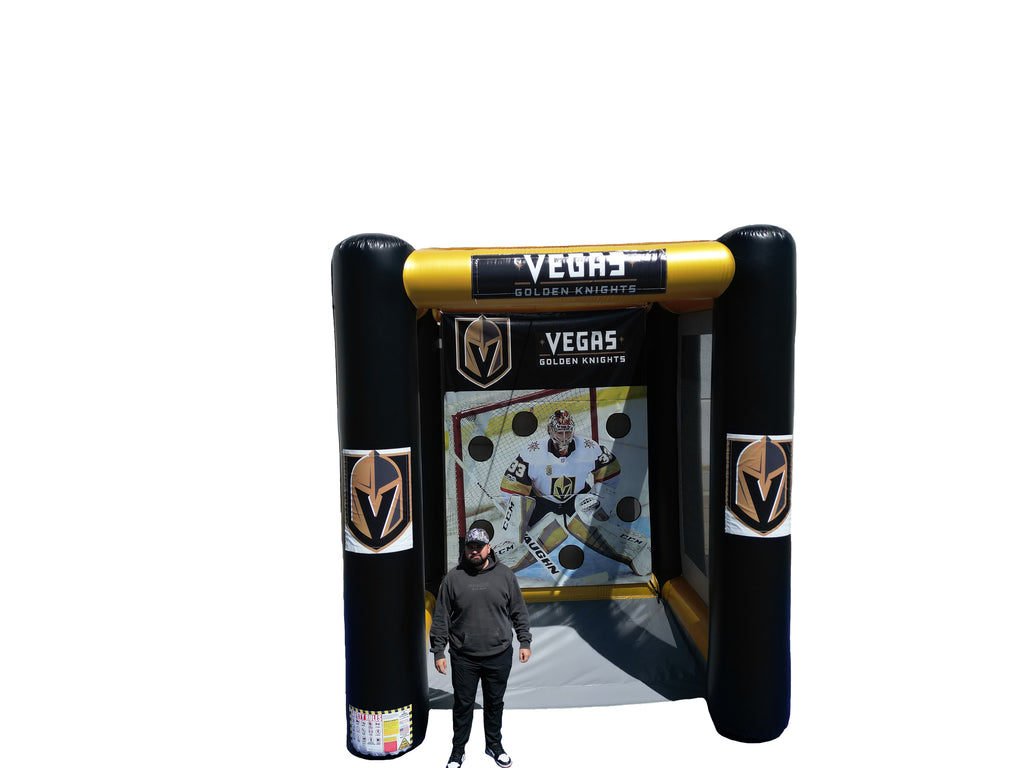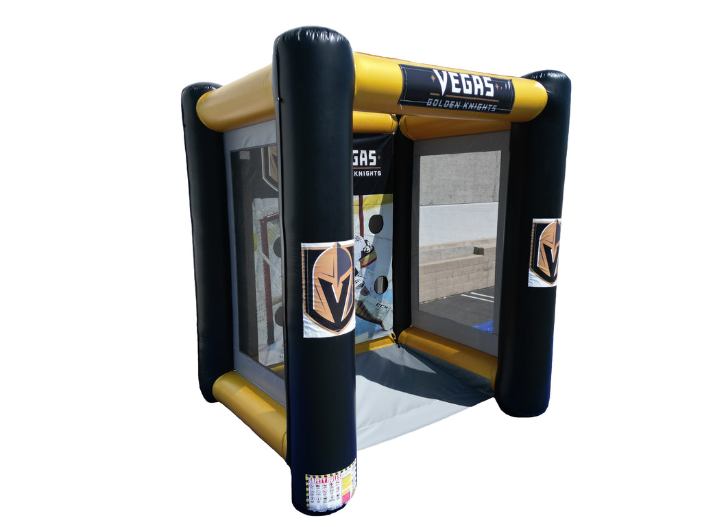 The hockey Shootout Game is a compact interactive inflatable that lets players test their accuracy by shooting pucks into multiple target holes. Designed with a goalie backdrop and enclosed play area, it’s perfect for friendly competitions, parties, school events, and sports-themed gatherings. Its smaller footprint makes it easy to fit in backyards, gyms, or event spaces while still delivering fast-paced fun for kids, teens, and adults.