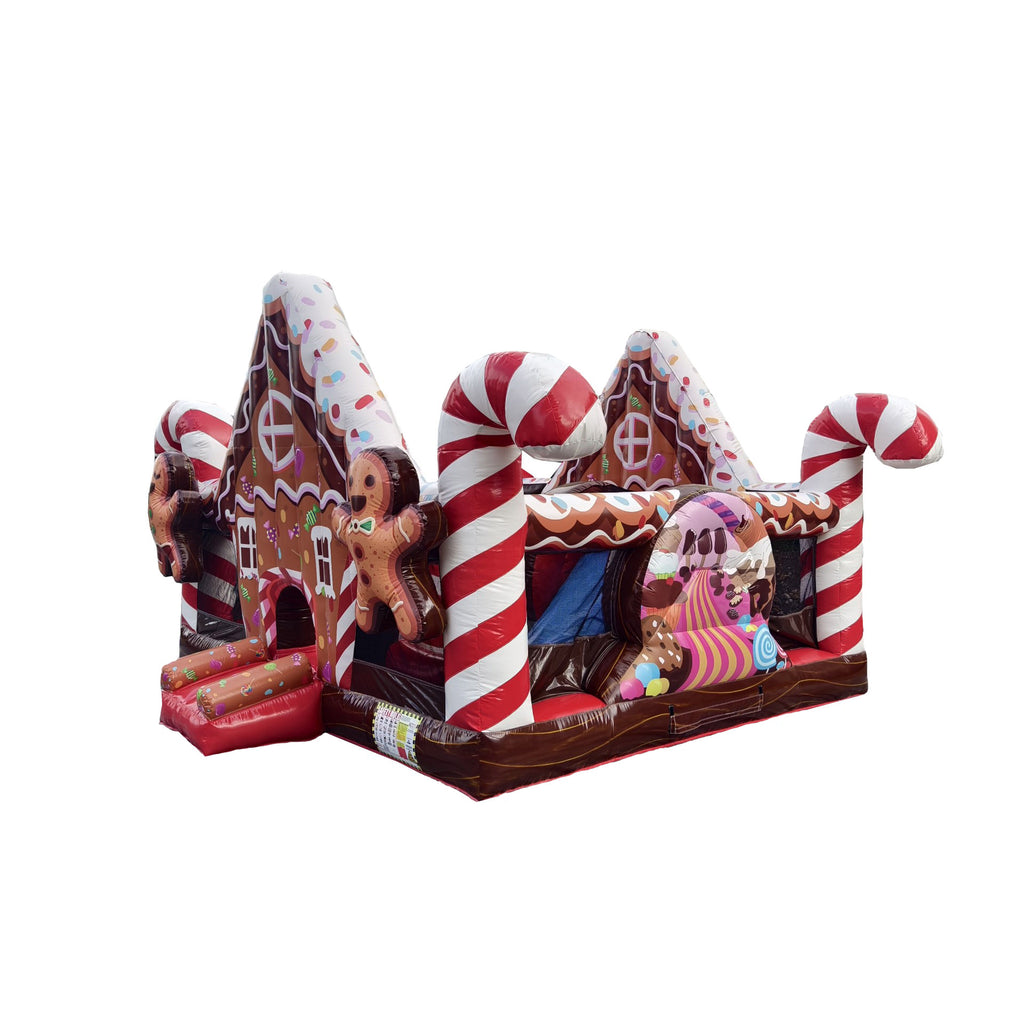 The Gingerbread Playland is a festive and charming addition to any rental company’s holiday lineup. Designed to look like a life-sized gingerbread house, it features bright candy-cane columns, smiling gingerbread characters, and colorful candy graphics that bring the holiday spirit to life.