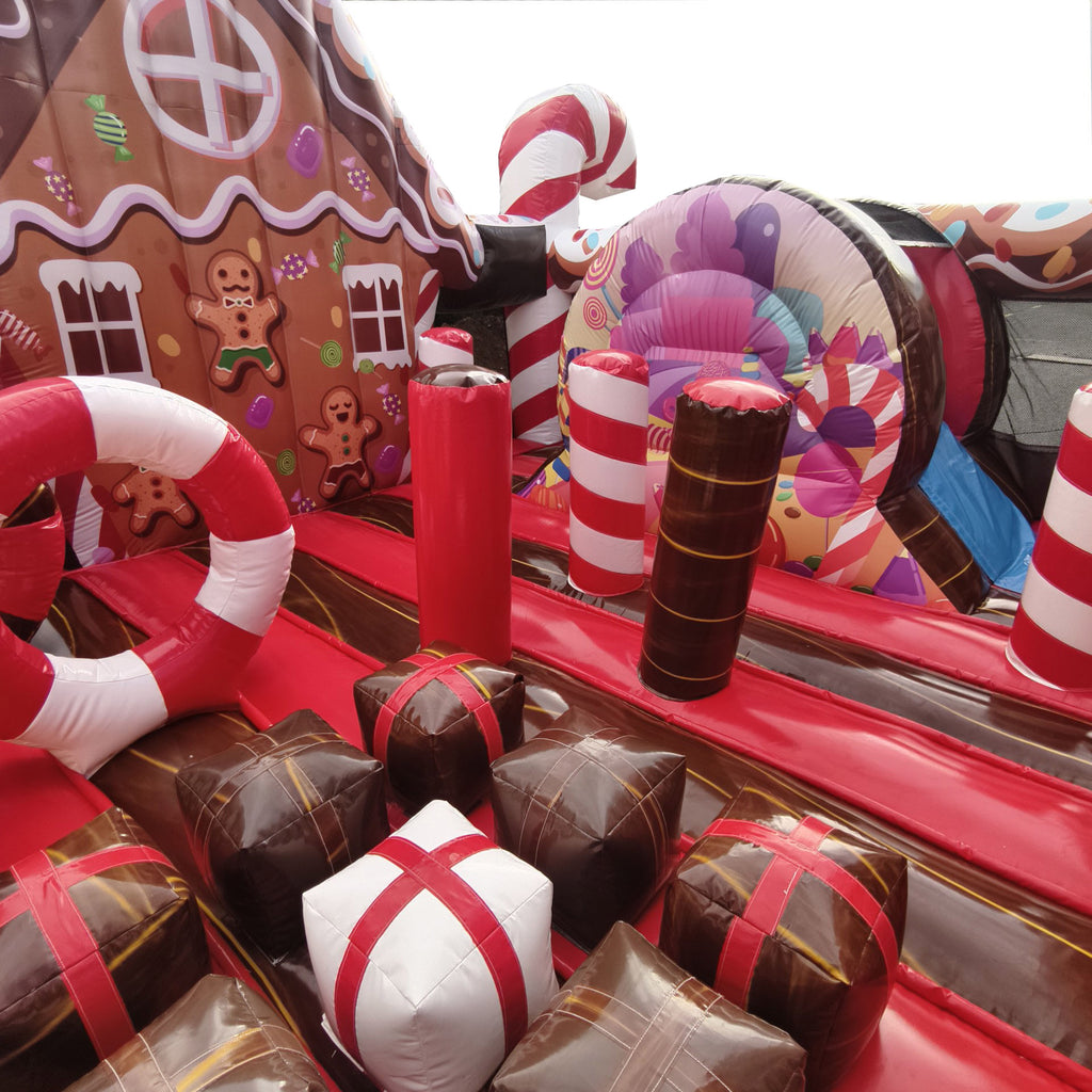 This playland offers a safe and exciting space for younger children, complete with a small slide, pop-up obstacles, and open play areas. Its compact footprint makes it ideal for indoor or outdoor events, including winter festivals, school functions, and Christmas parties. Built from 16 oz commercial-grade PVC vinyl with reinforced stitching, the Gingerbread Playland is made for durability, easy cleaning, and reliable seasonal performance.