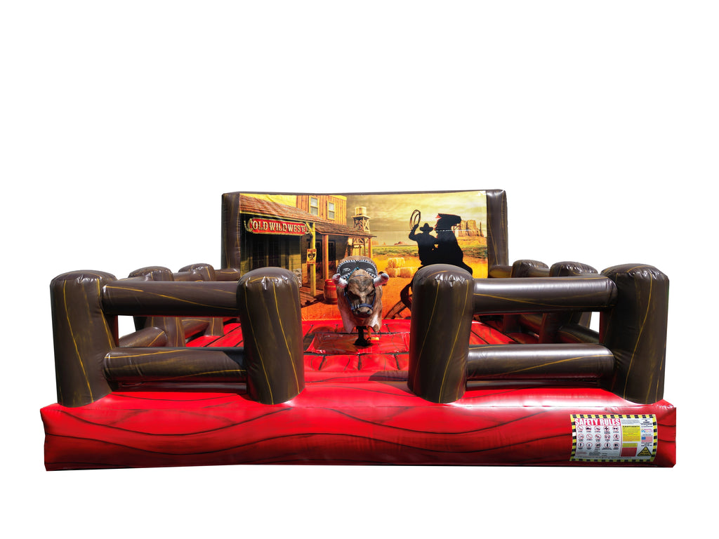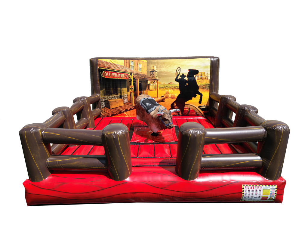 The Rodeo Bull Mat is a western-themed inflatable landing area designed specifically for use with a separate mechanical bull system. This listing includes the inflatable mat only and does not include a bull or mechanical components. Featuring rustic wood-grain patterns, corral-style inflatable fencing, and a Wild West backdrop, it provides a safe, cushioned arena for riders while enhancing the overall rodeo atmosphere. Built from 16 oz commercial-grade PVC vinyl with reinforced stitching, the Rodeo Bull Mat Only delivers reliable protection, easy maintenance, and strong rental value as a high-quality landing surface for bull operators.